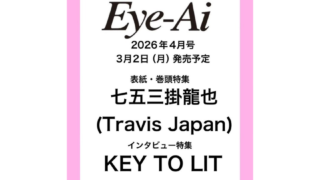 雑誌Eye-Ai 2026年 4月号 (表紙/七五三掛龍也) 3/2発売 「Eye-Ai 4月号」 掲載内容詳細 《表紙・巻頭特集》 七五三掛龍也 Eye-Ai 2026年 4月号 Amazon 楽天ブックス 7net TOWER RECORDS Yahooショッピング2026.02.01七五三掛龍也雑誌