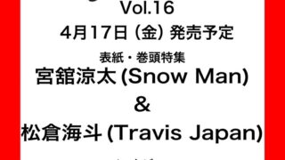 雑誌Eye-Ai+ Vol.16 (表紙/松倉海斗) 4/17発売 「Eye-Ai+ Vol.16」 掲載内容詳細 《表紙・巻頭特集》 宮舘涼太&松倉海斗 Eye-Ai+ Vol.16 Amazon 楽天ブックス 7net TOWER RECORDS Yahoo!ショッピング(TSUTAY...2026.03.17松倉海斗雑誌