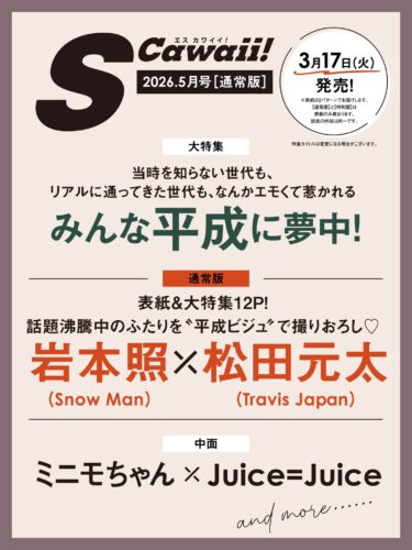 S Cawaii! 2026年 5月号 (表紙/松田元太)雑誌2026.02.203/17発売 「S Cawaii! 5月号」 掲載内容詳細 《通常版表紙 & 12P大特集》 岩本照×松田元太 話題沸騰中のふたりを“平成ビジュ”で撮りおろし♡S Cawaii! 2026年 5月号Amazon楽天ブックス7netTOWER RECORDS