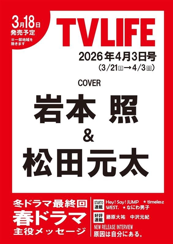 TV LIFE 2026年 4/3号 (表紙/松田元太)雑誌Version 1.0.02026.02.213/18発売 「TV LIFE 4/3号」 掲載内容詳細 《表紙》岩本照&松田元太TV LIFE 2026年 4/3号Amazon楽天ブックス7netTOWER RECORDS